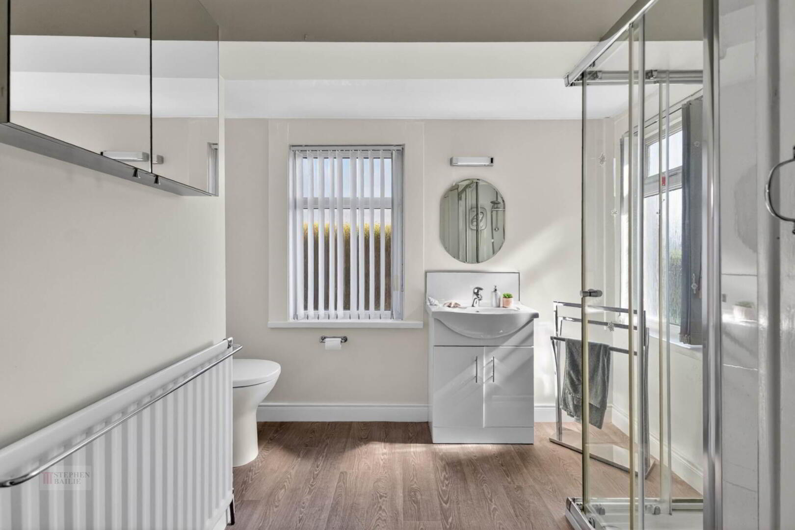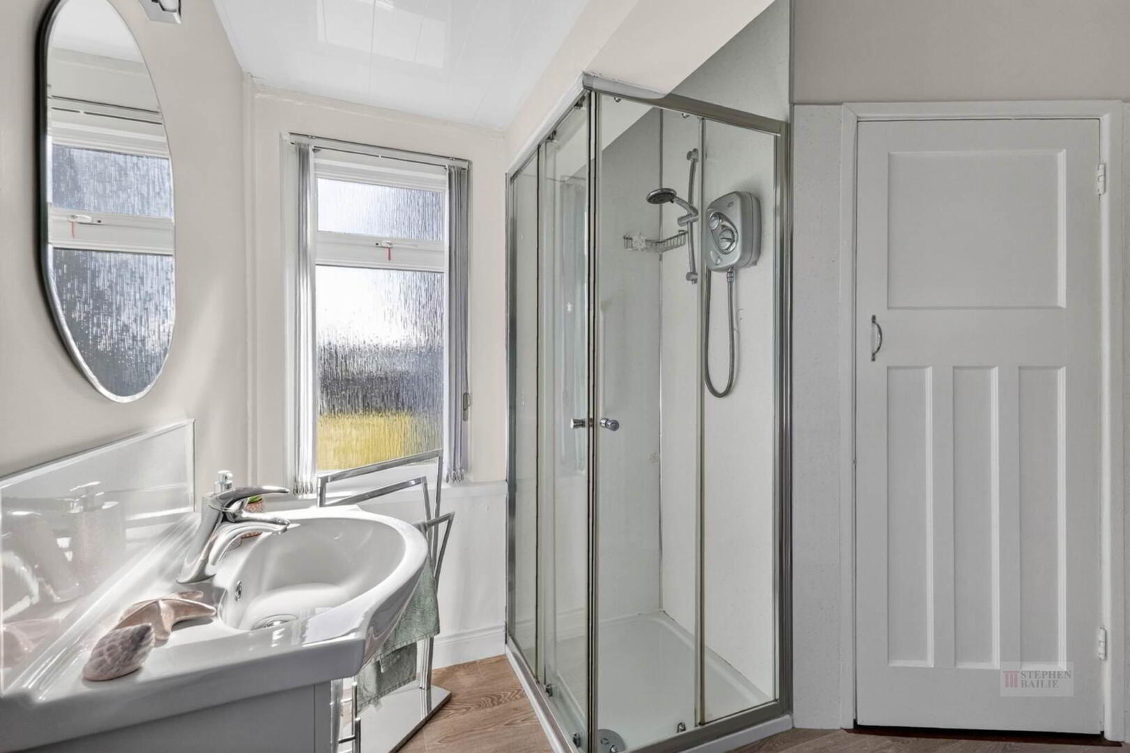 Vanitory unit. Low flush w.c. Shower cubicle with electric shower. Hotpress.