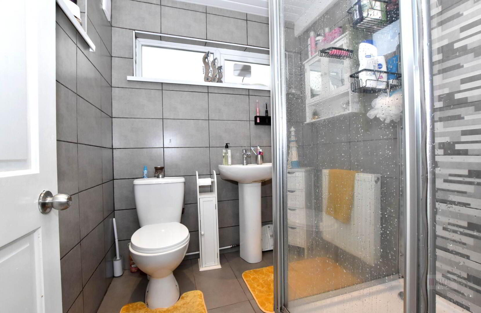 Pedestal wash hand basin. Low flush w.c. Shower cubicle with shower. Full wall tiling. Ceramic tiled floor.