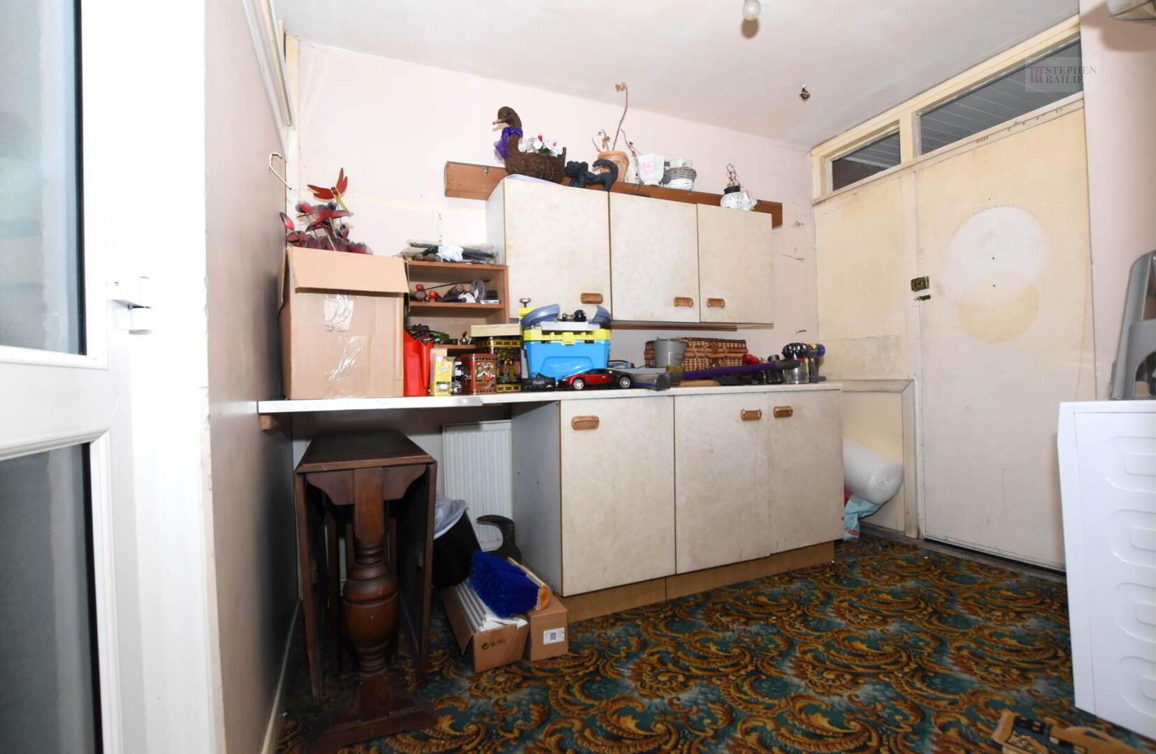 Single drainer stainless steel sink unit. Good range of fitted high low Kitchen units with roll edged worktops. Part wall tiling. Larder cupboards.