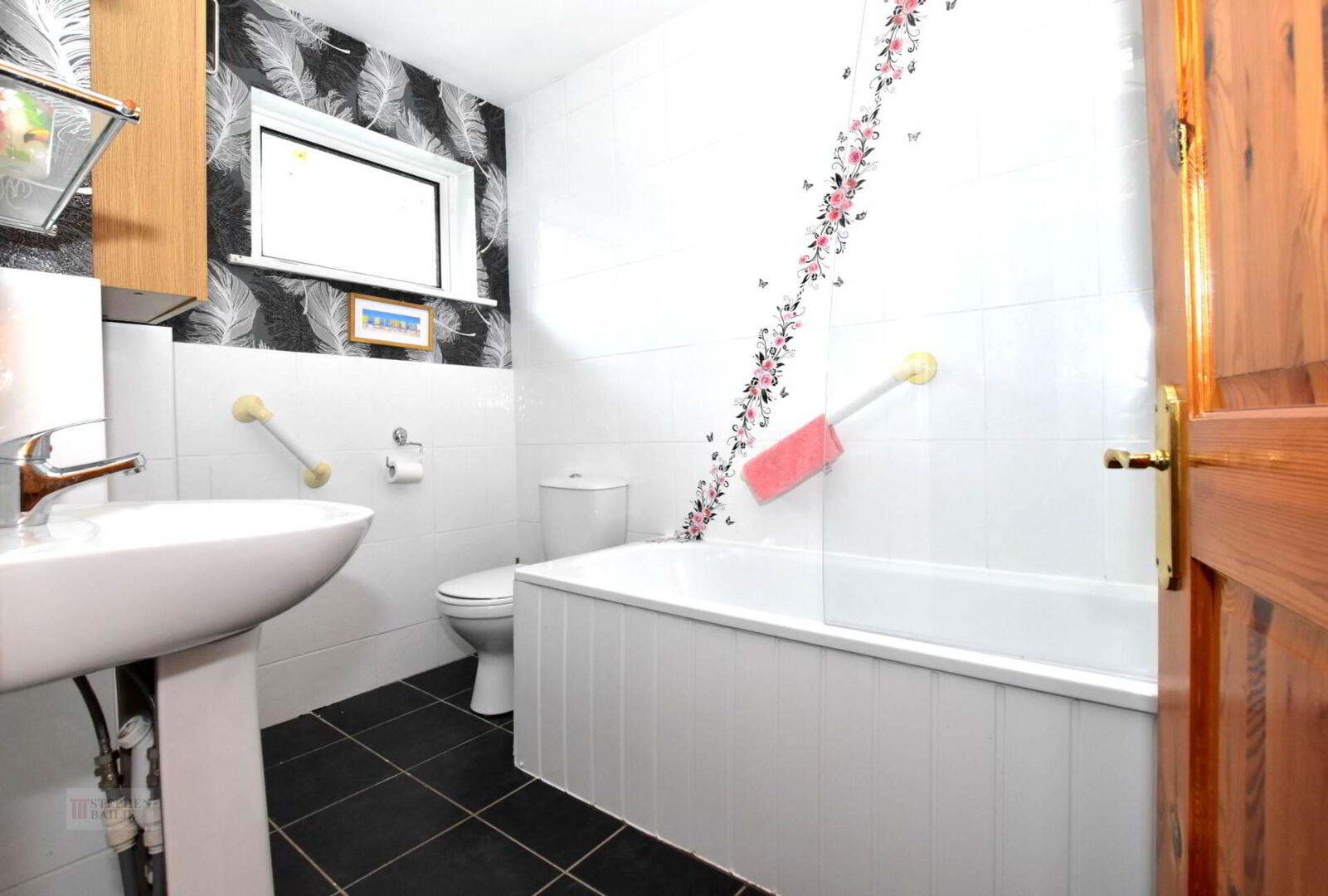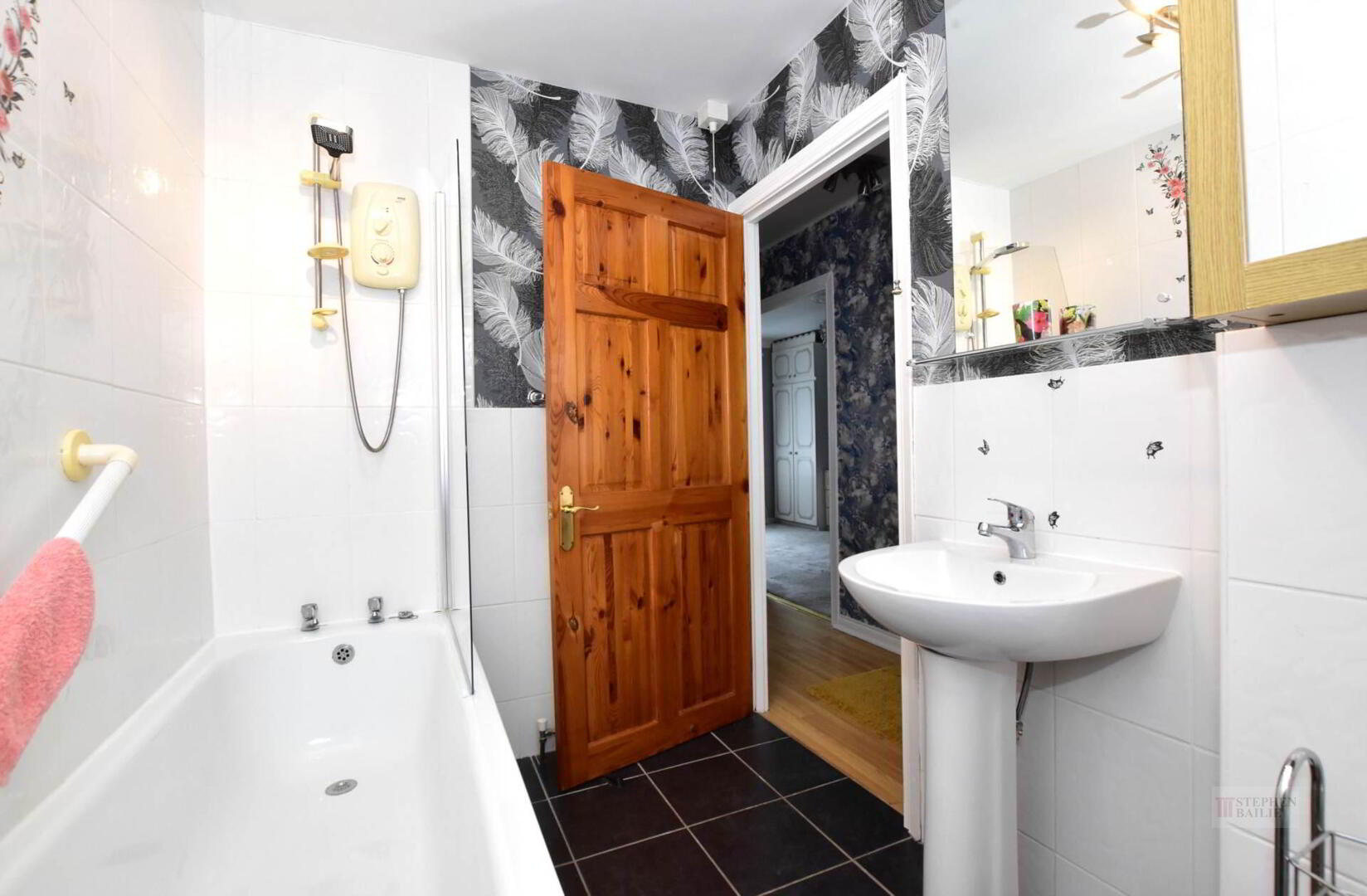 Panel bath with electric shower over. Pedestal wash hand basin. Low flush w.c. Part wall tiling.
