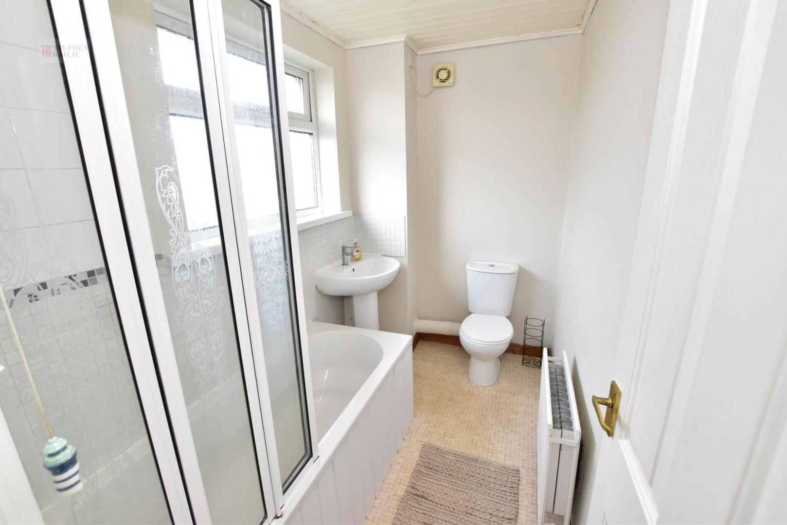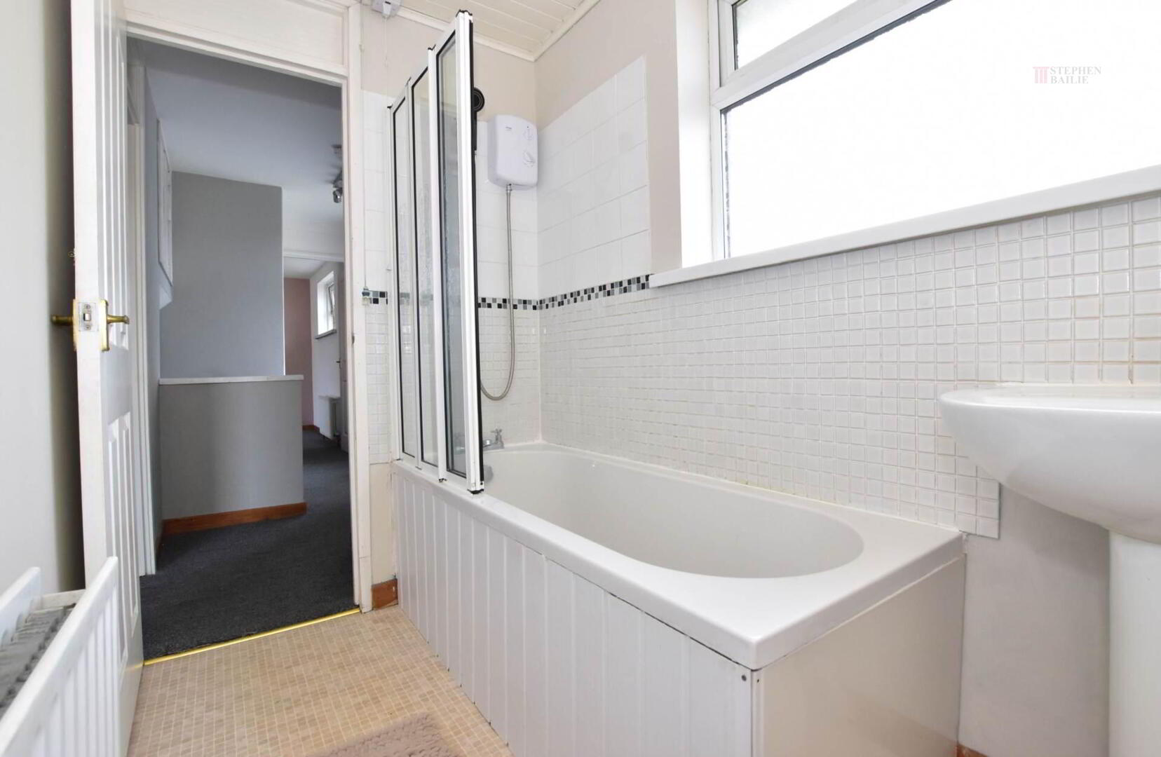 Pedestal wash hand basin. Low flush w.c. Panel bath with electric shower over. Part wall tiling.