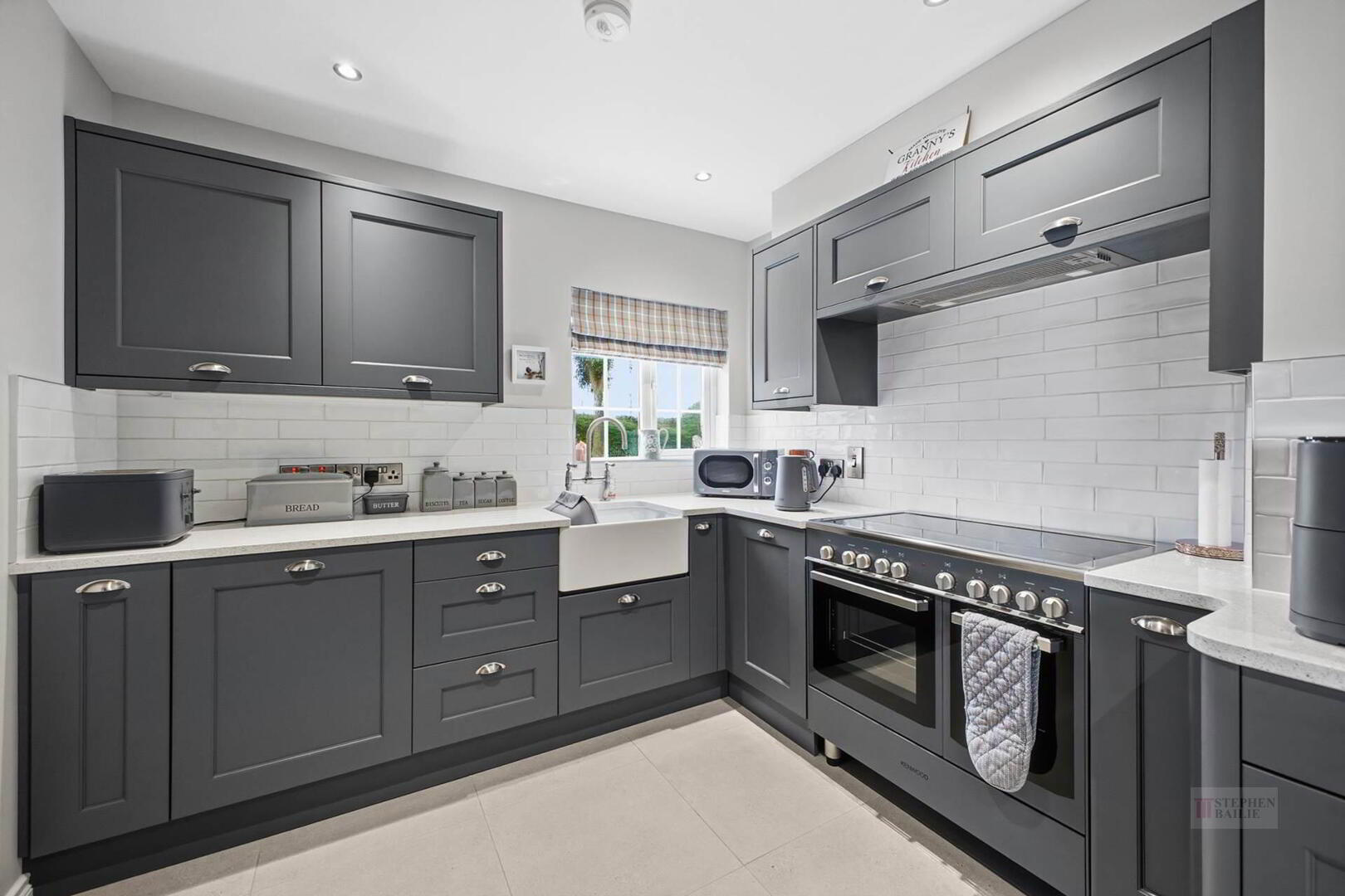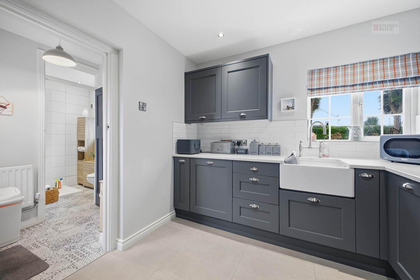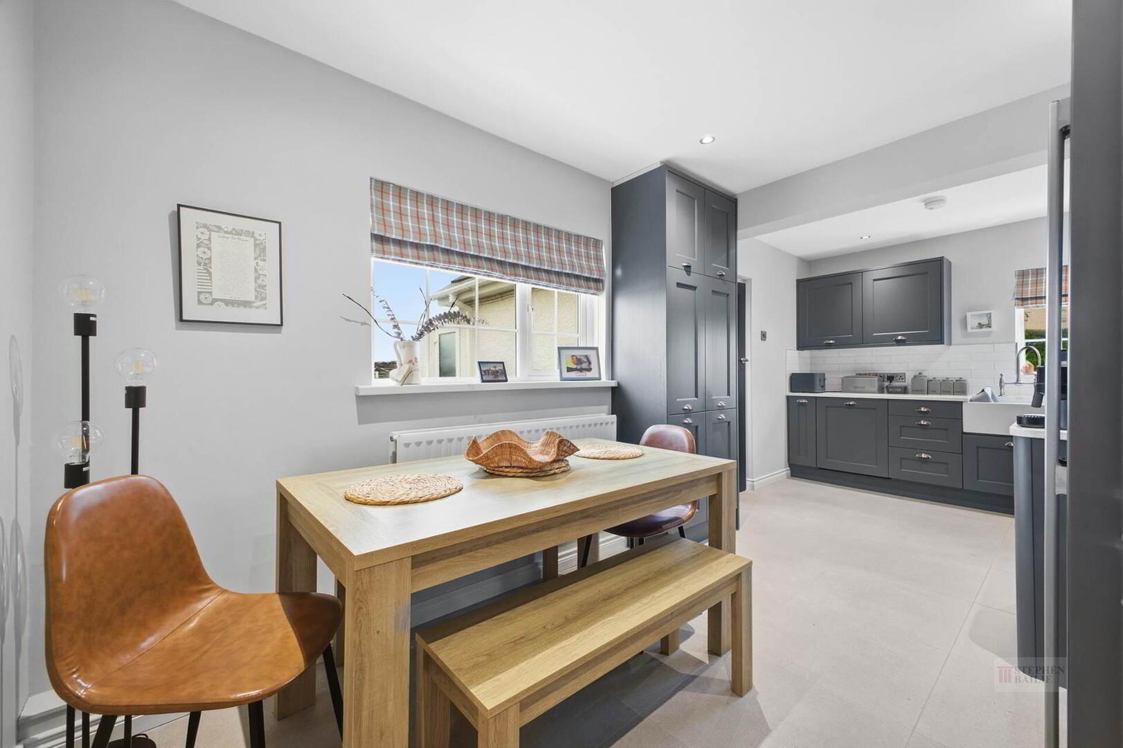 Belfast type sink. Excellent range of fitted high and low level kitchen units with solid work tops. Five ring electric range. Integrated dishwasher. Part wall tiling. Ceramic tiled floor. Dining area.