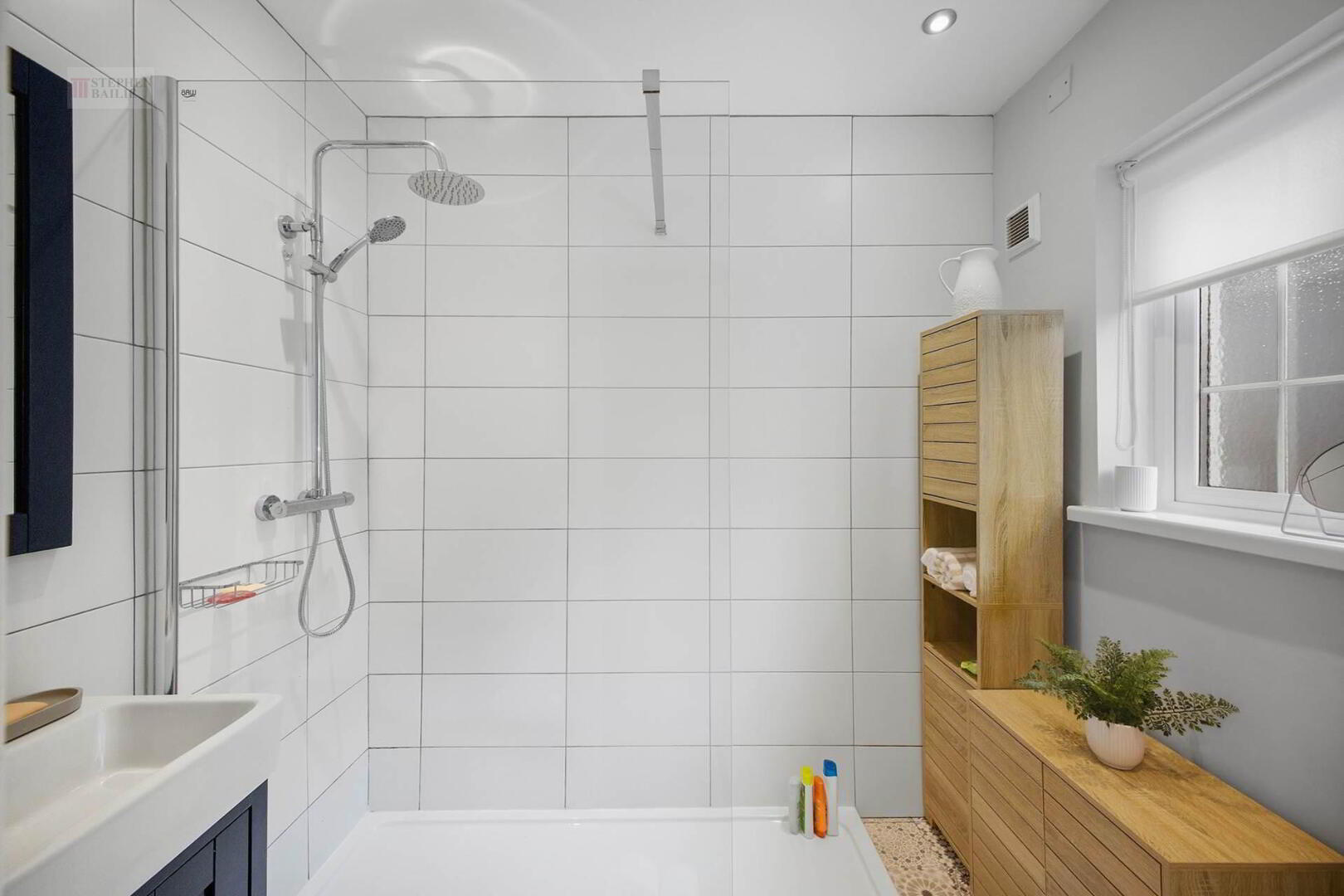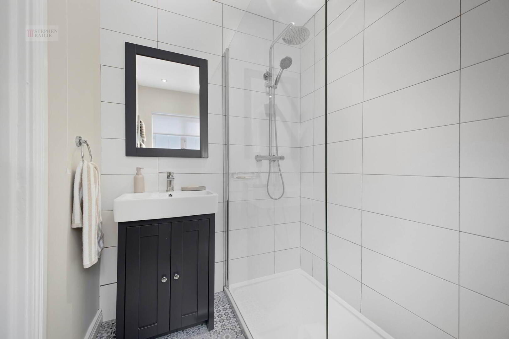 Shower cubicle with shower. Vanitory unit. Low flush w.c. Full wall tiling. Ceramic tiled floor.