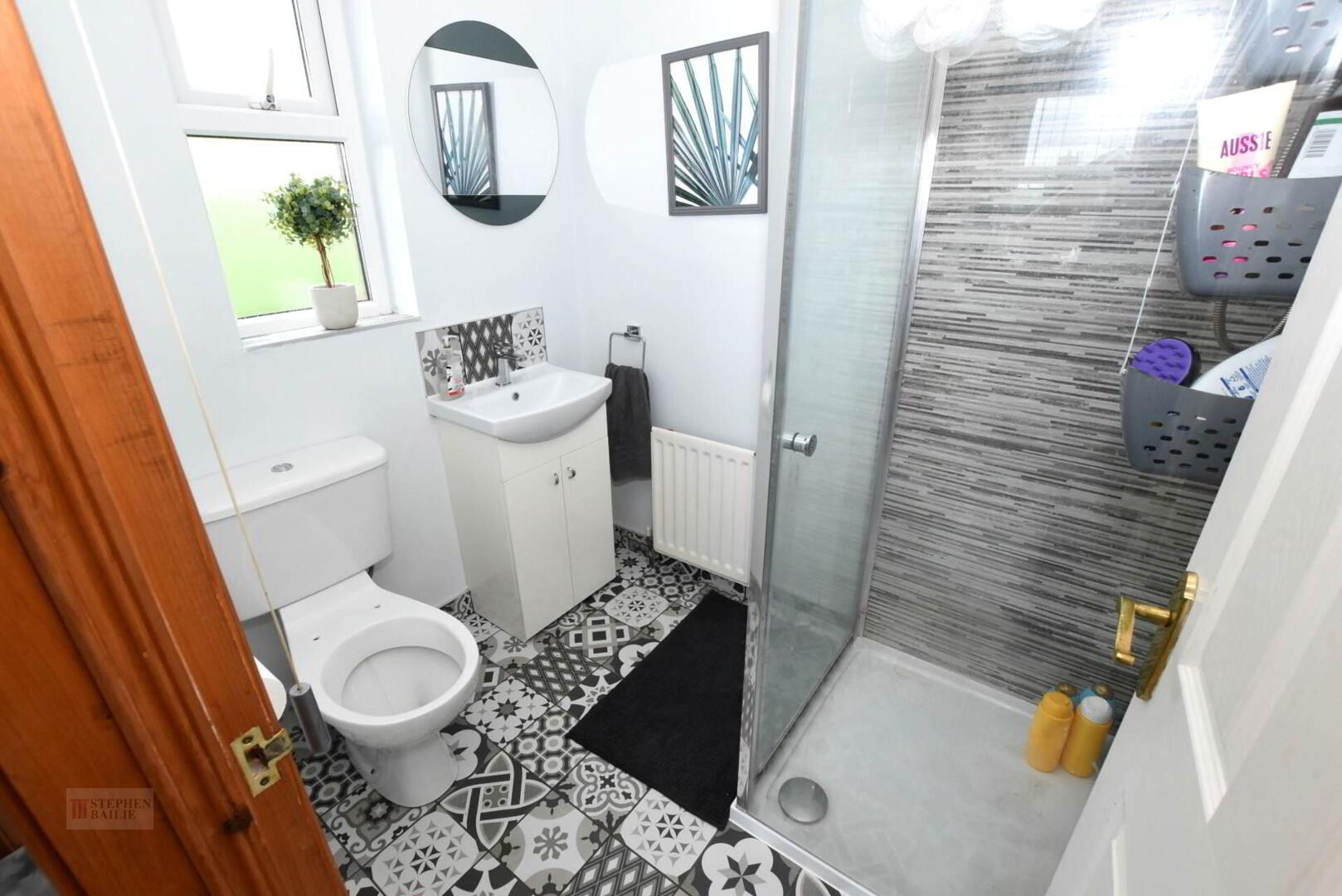 Low flush w.c. Vanitory unit. Shower cubicle with electric shower.
