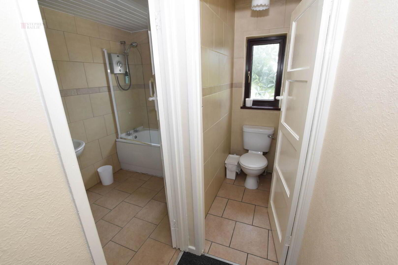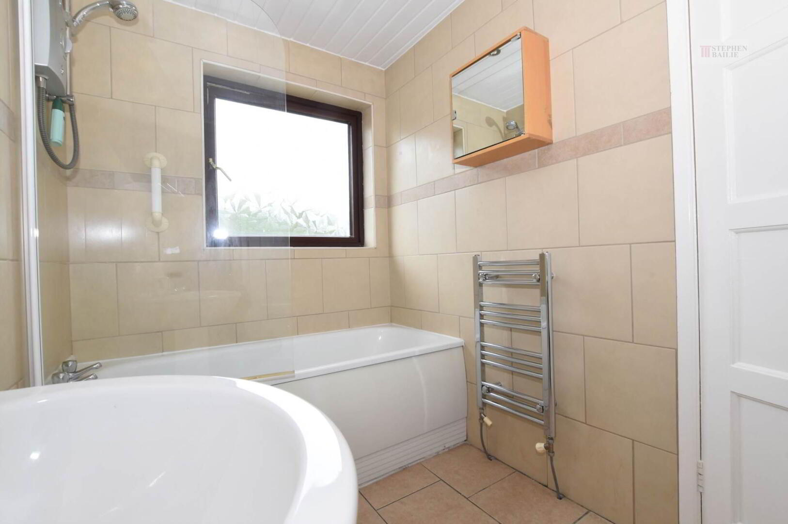 Panel bath with electric shower over. Pedestal wash hand basin. Full wall tiling. Hot press.