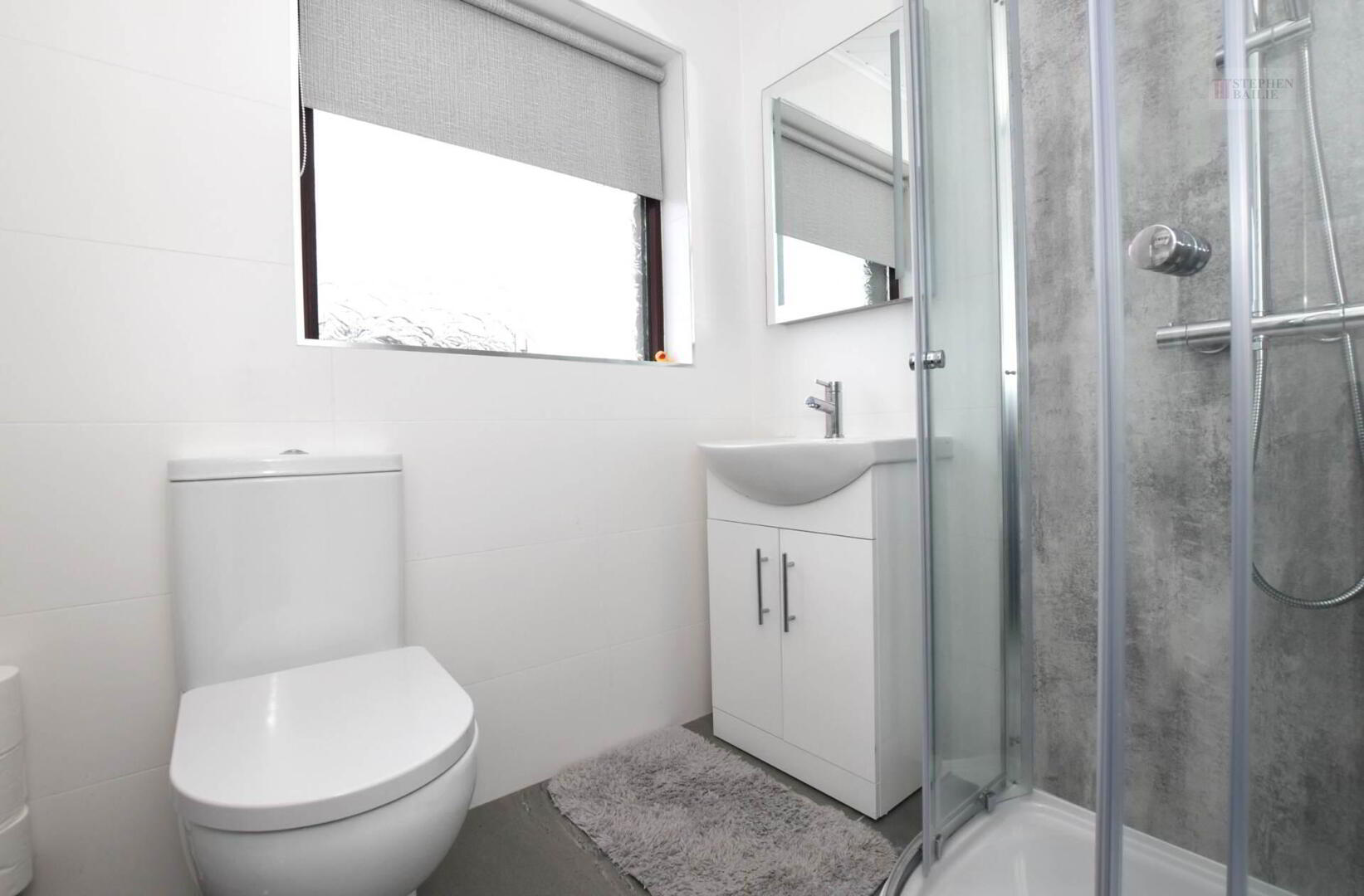 Vanitory unit. Low flush w.c. Shower cubicle with shower. Full wall tiling,