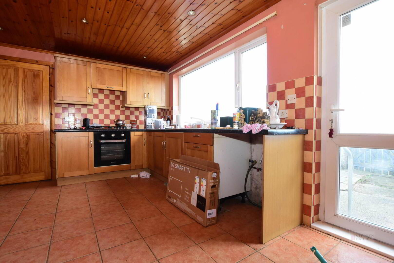 Single drainer sink unit. Range of fitted high and low kitchen units with roll edged work tops. 4 ring gas hob and built in under oven. Part wall tiling. Ceramic tiled floor. Larder cupboard