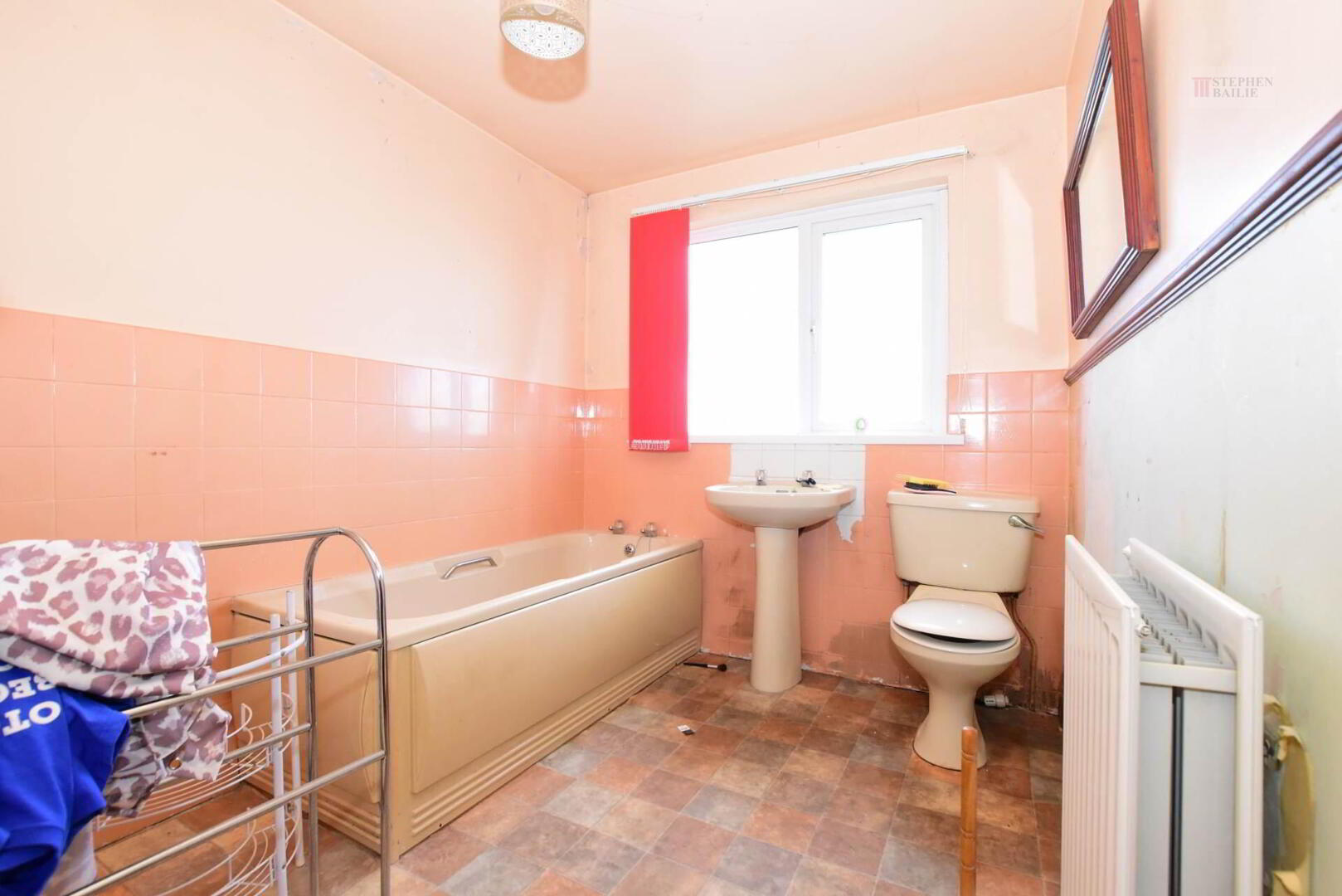 Panel bath. Pedestal wash hand basin. Low flush w.c. Tiled shower cubicle.