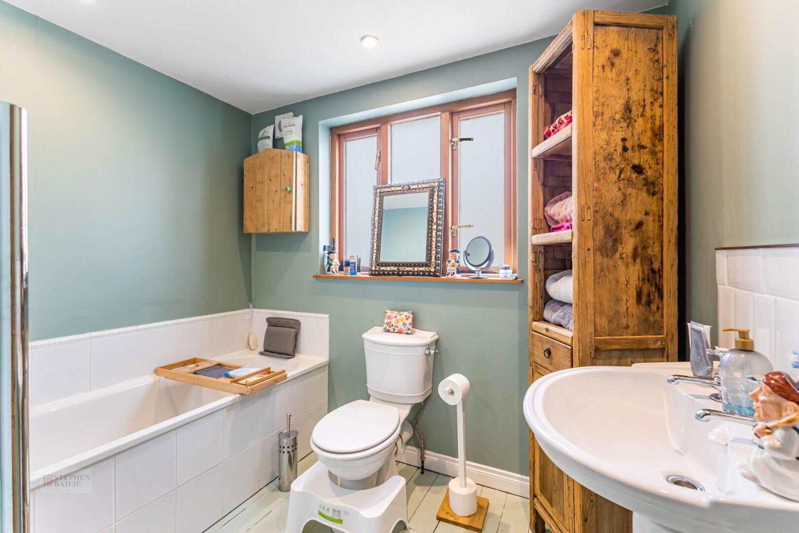 Panel bath with antique style mixer taps. Low flush w.c. Pedestal wash hand basin. Natural wooden floor.