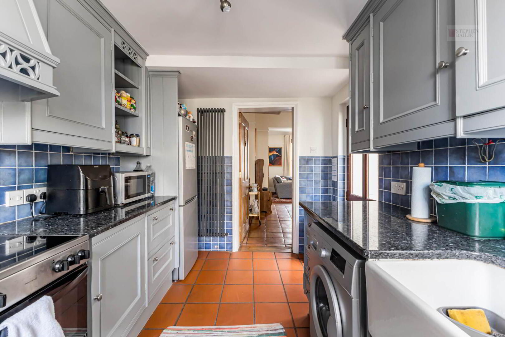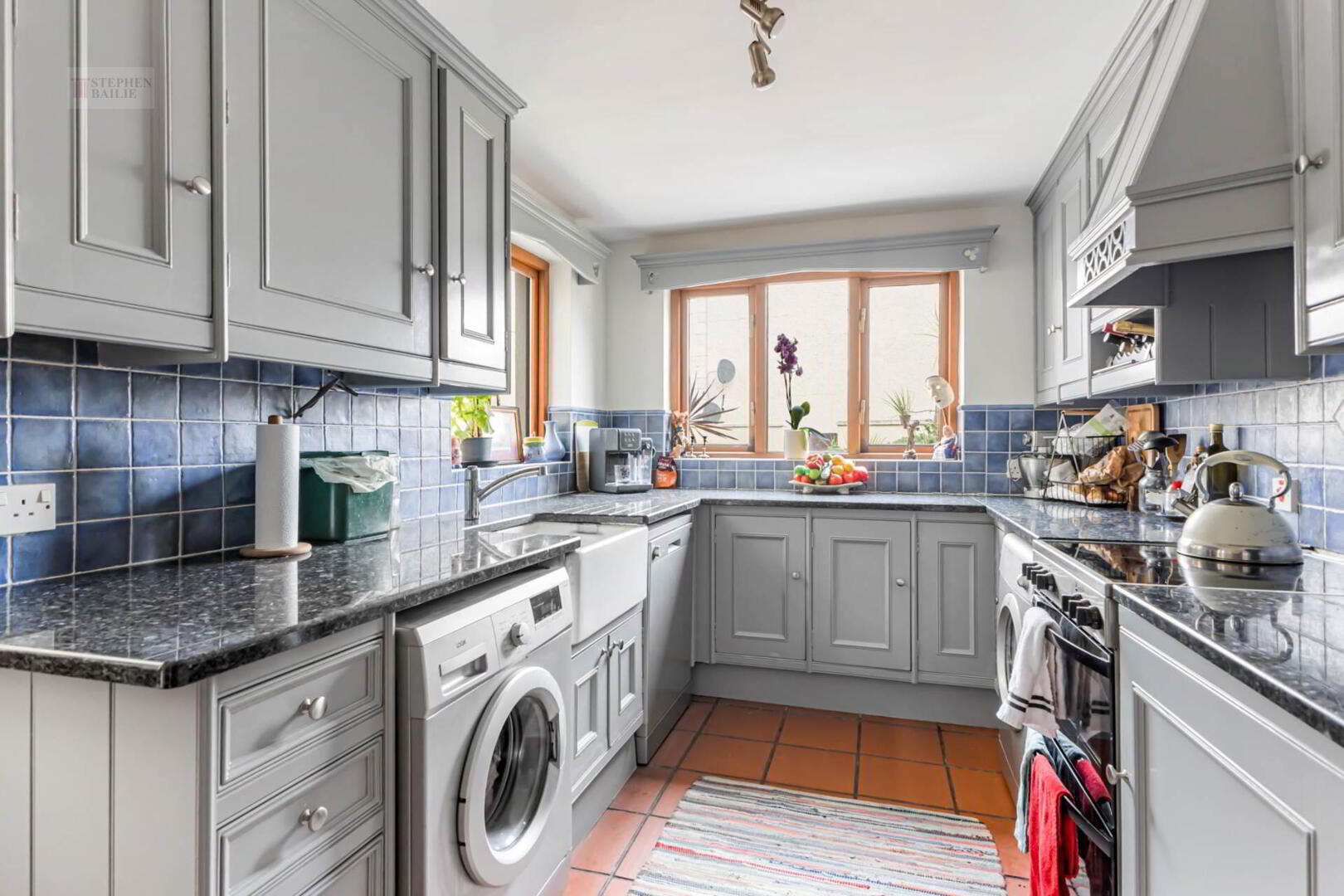 Belfast type sink with mixer taps. Excellent range of fitted high and low level kitchen units with roll edged work tops. Plumbed for washing machine and dishwasher. Part wall tiling. Ceramic tiled floor.