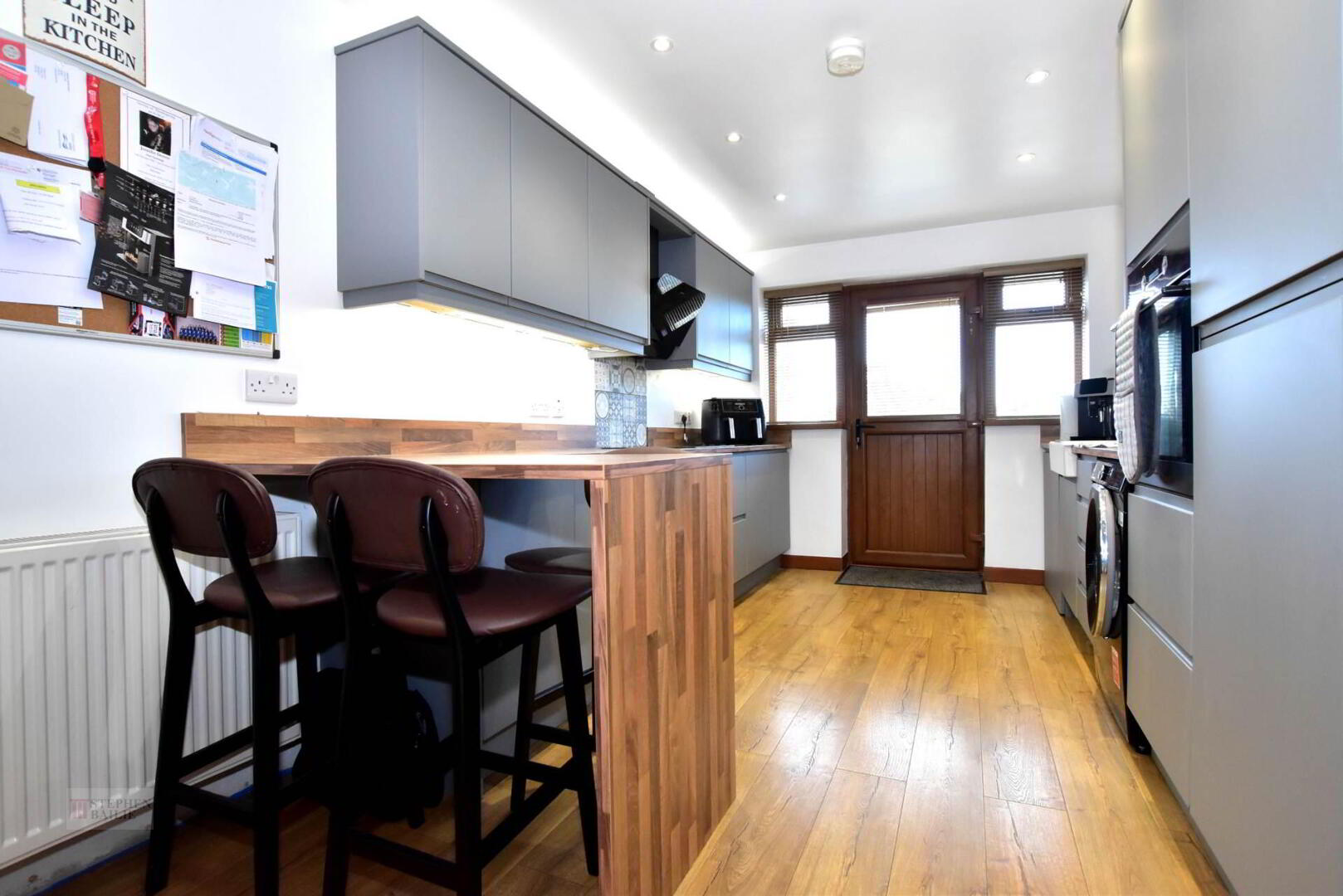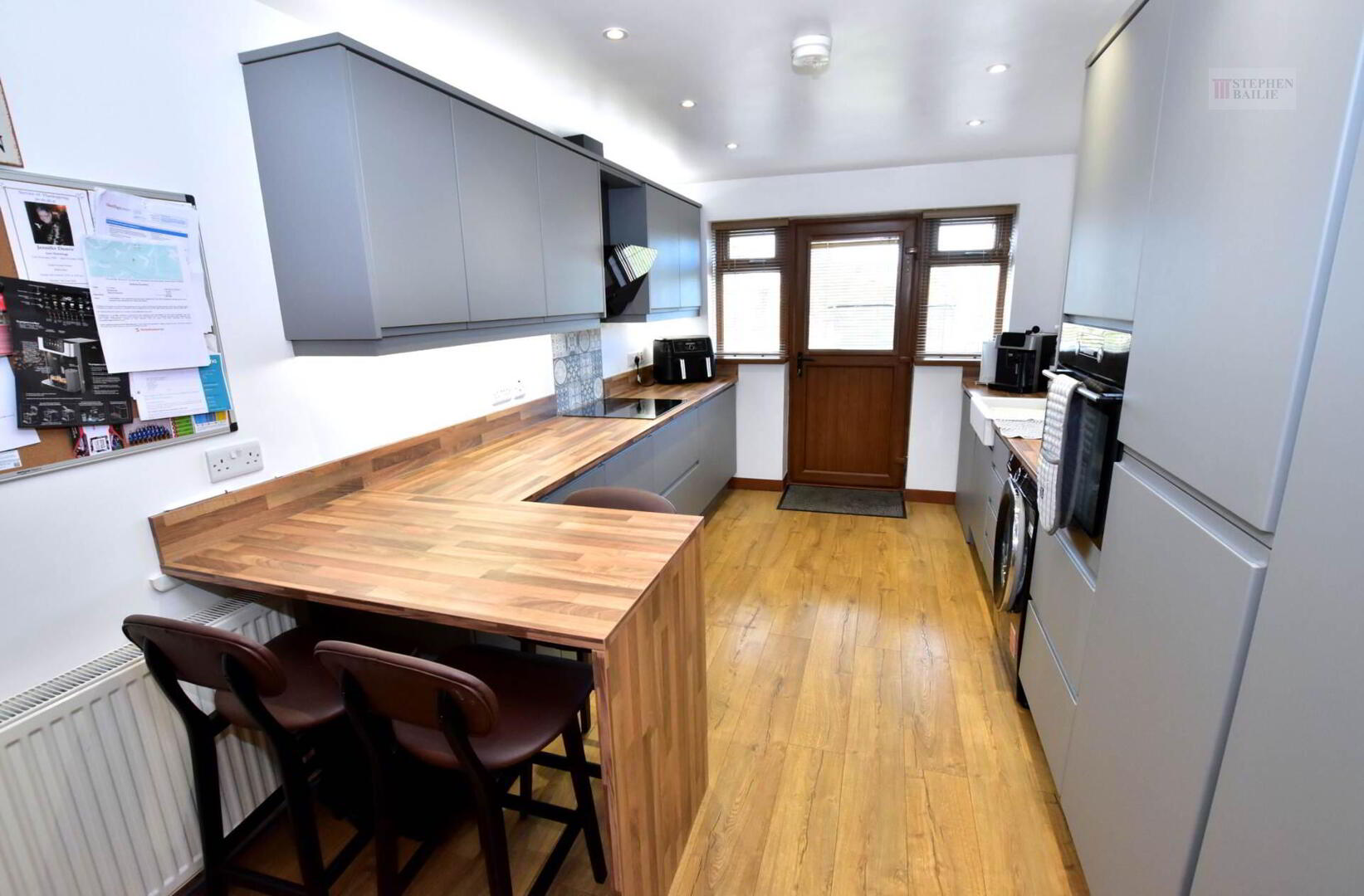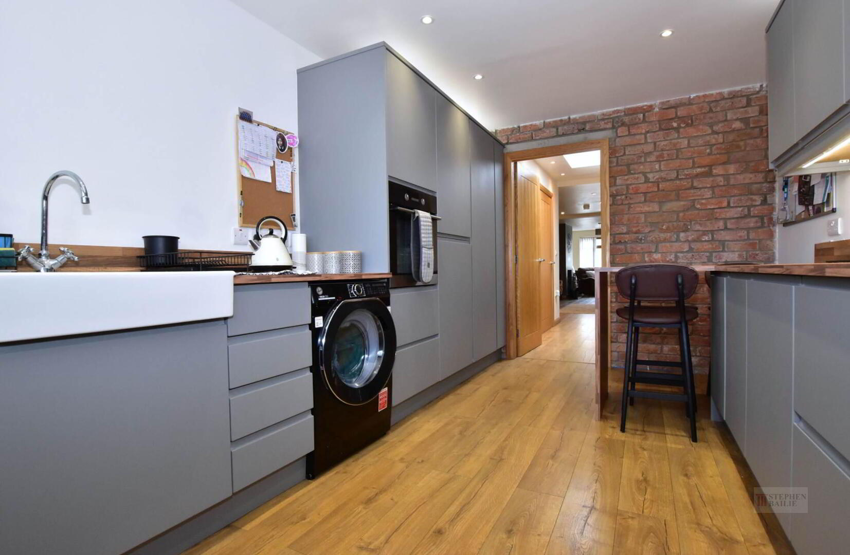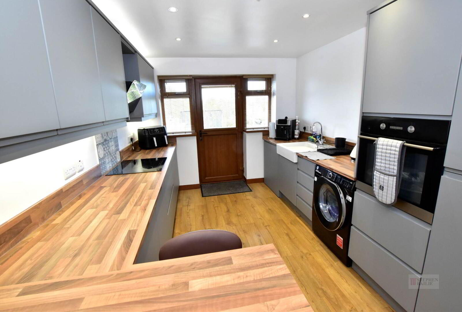 Belfast type sink. Excellent range of fitted high and low level kitchen units with wooden worktops. Four ring electric hob and built in oven. Integrated fridge freezer. Plumbing for washing machine. Part wall tiling.