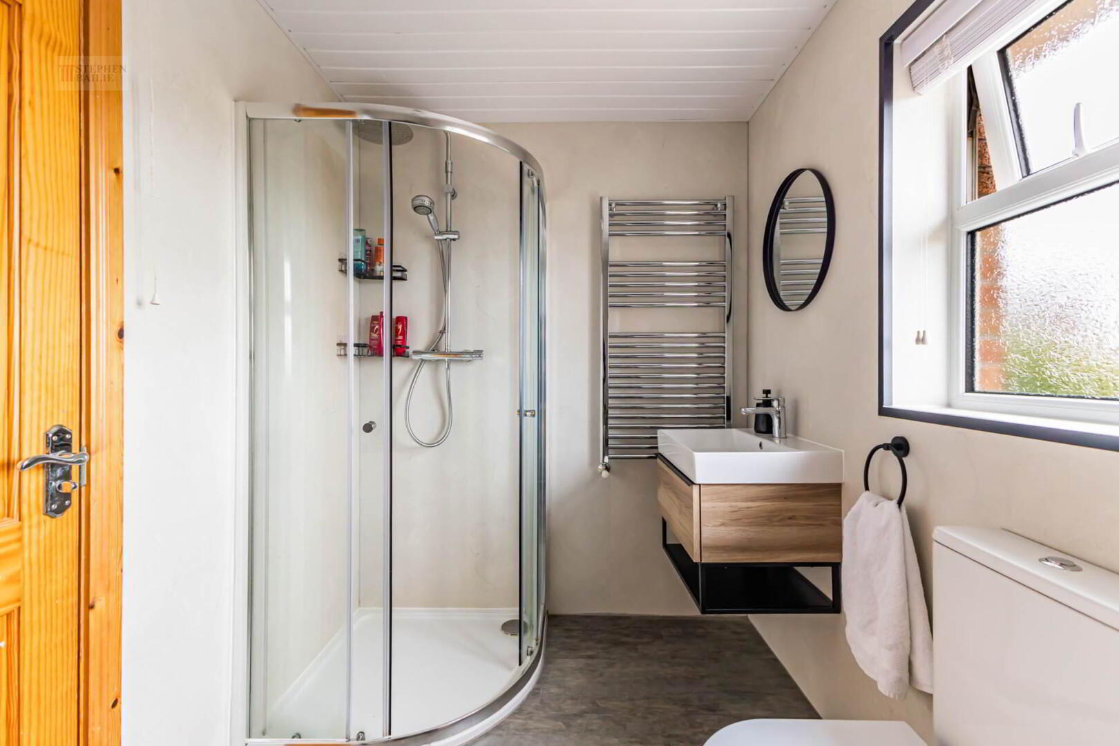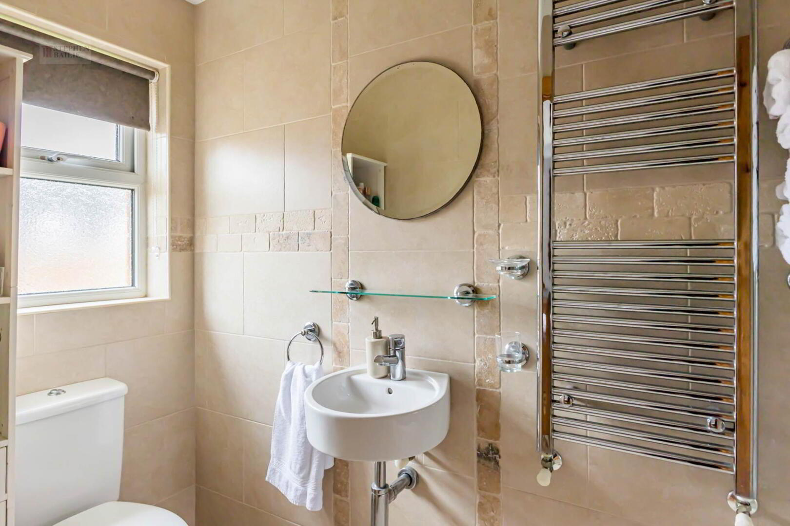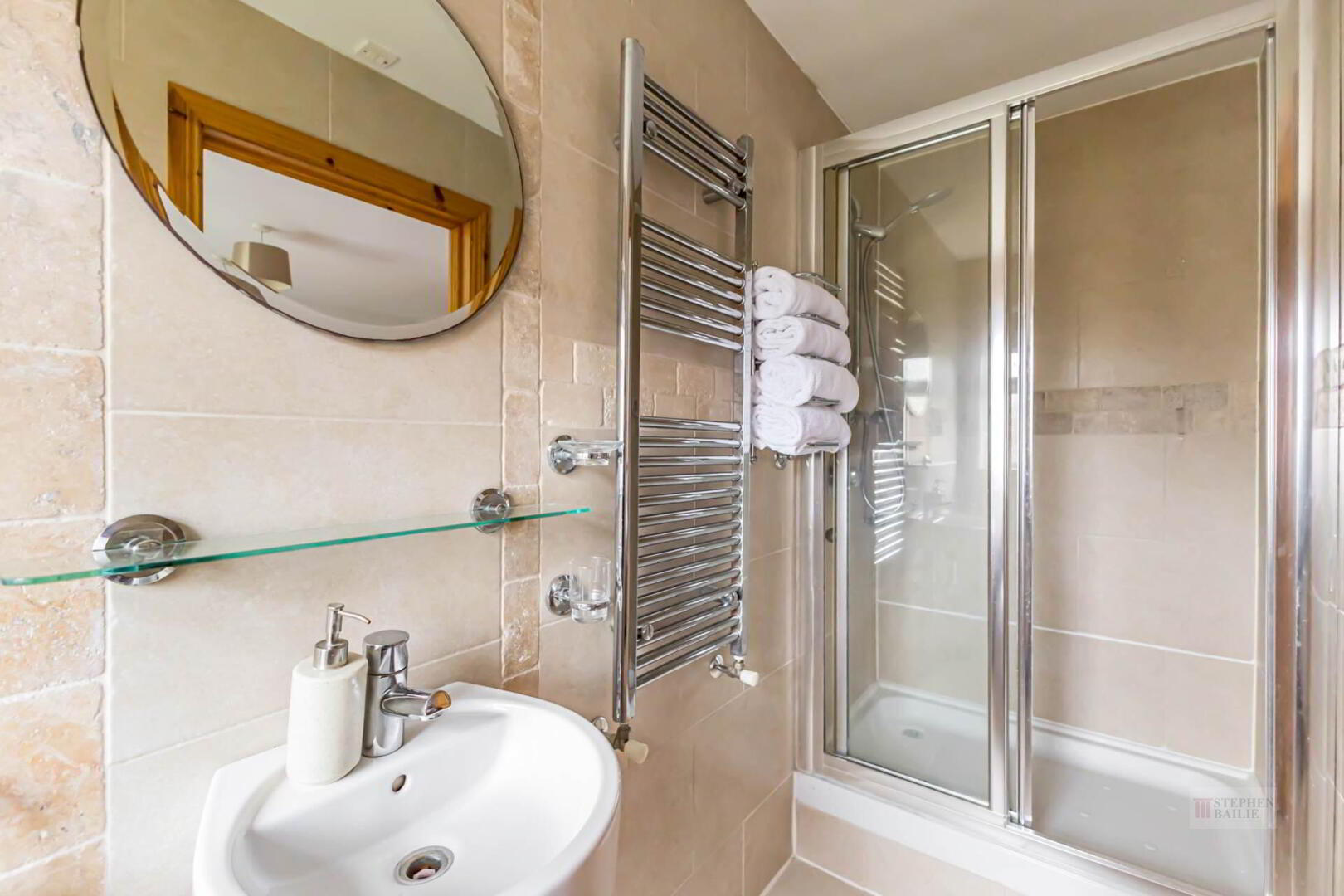 Wash hand basin. Shower cubicle with shower. Low flush w.c. Heated towel rail. Fully tiled.