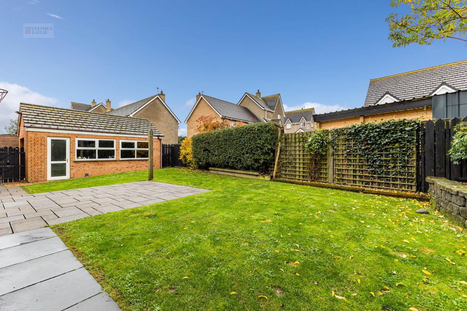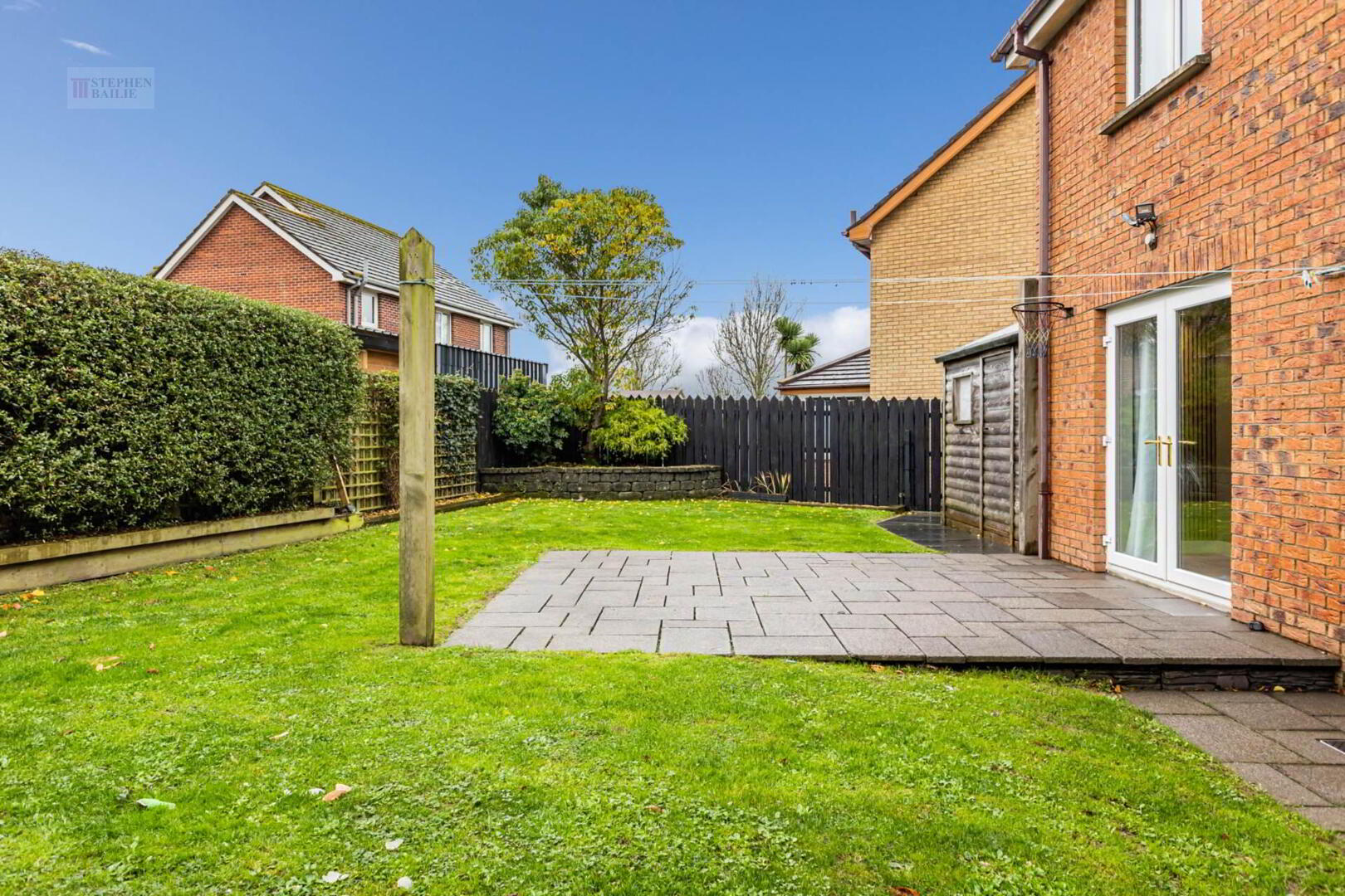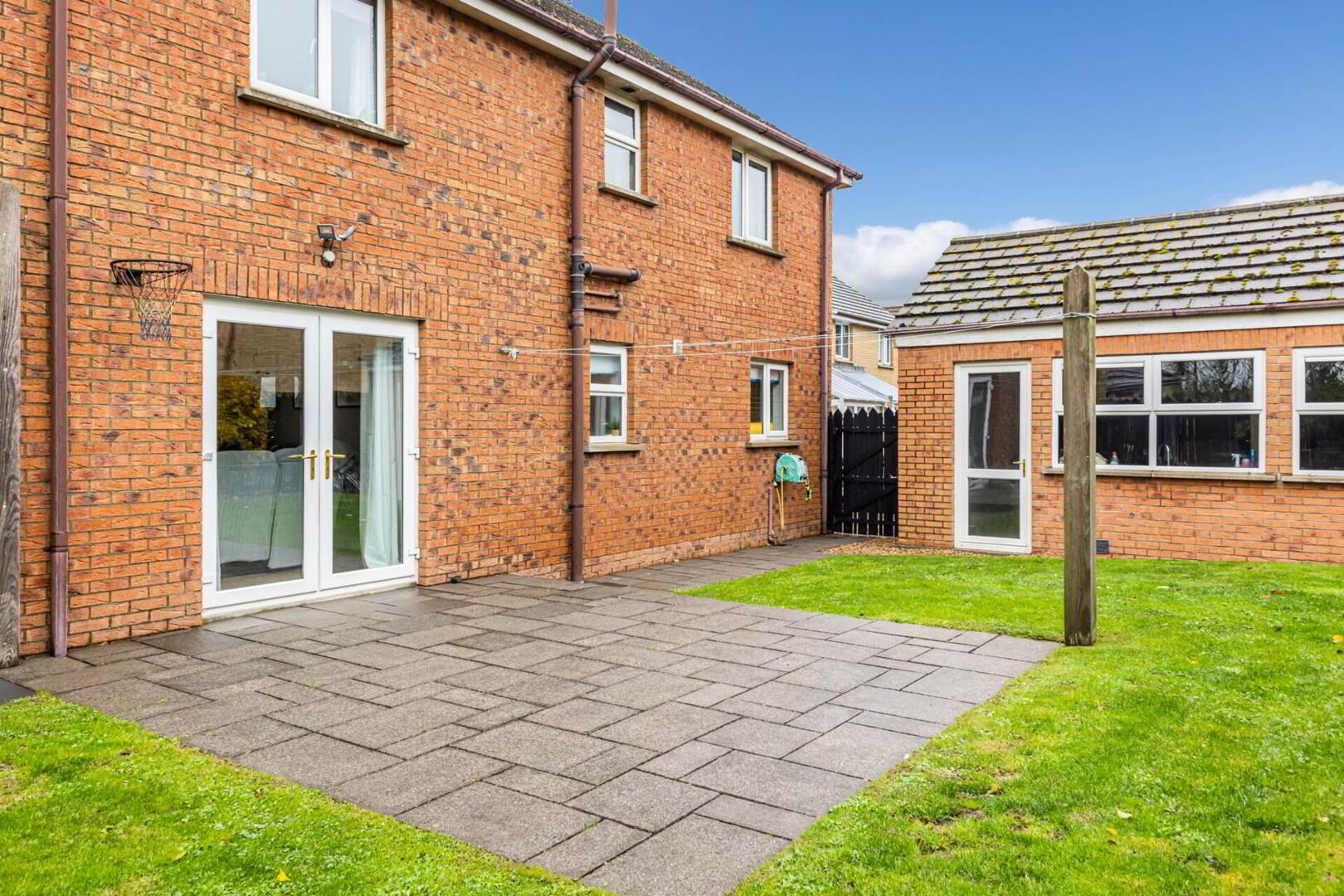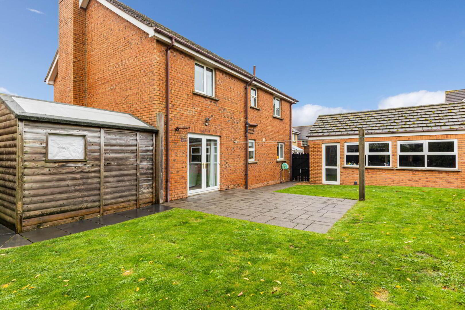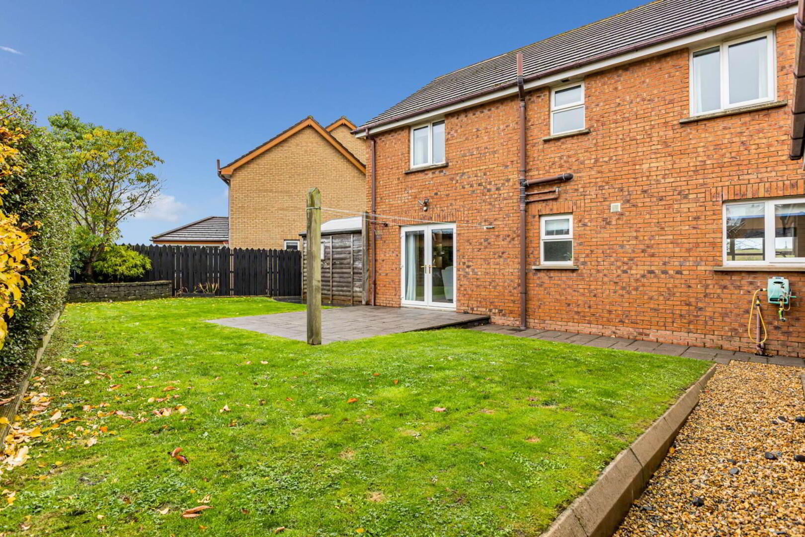 Enclosed garden to the rear in lawn with flagged patio area.