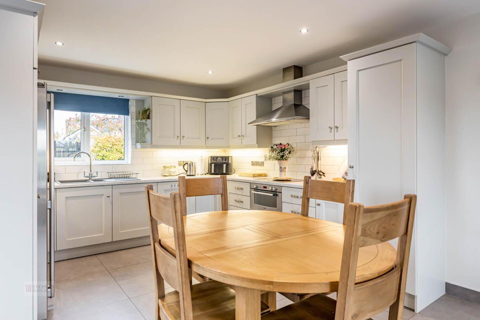 1 1/4 tub single drainer sink unit. Good range of fitted high and low level kitchen units with rolled edged work tops. Four ring electric hob and built in unde roven. Integrated dishwasher. Part wall tiling. Ceramic tiled floor.