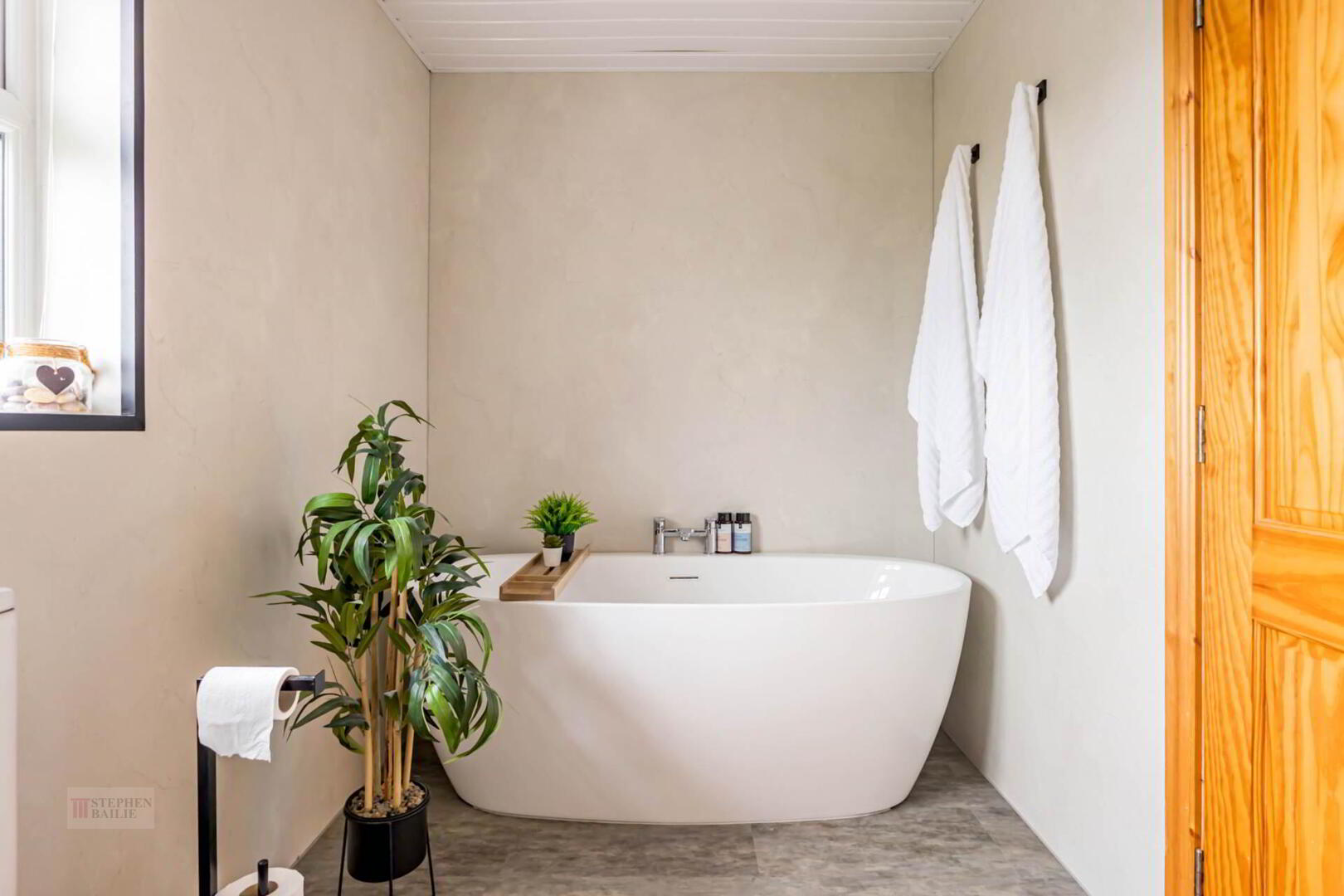 Oval free standing bath with mixer taps. Low flush w.c. Wash hand basin. Shower cubicle with shower. Stainless steel heated towel rail.