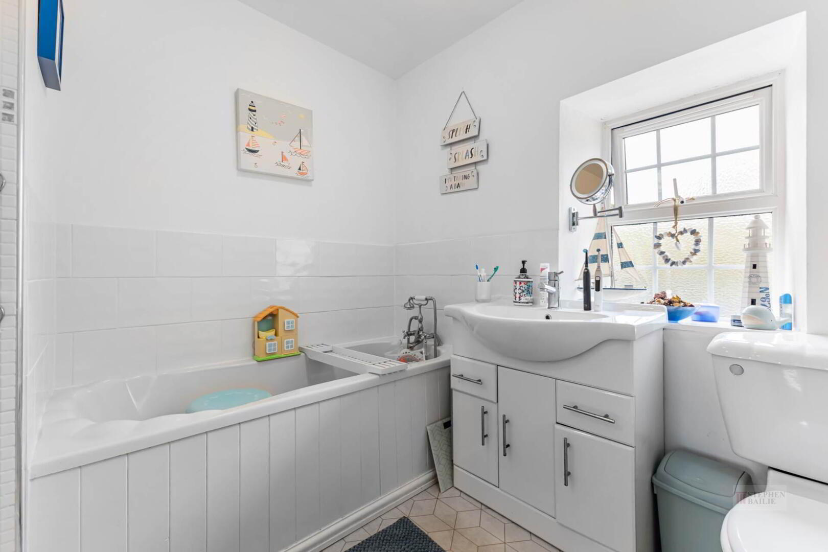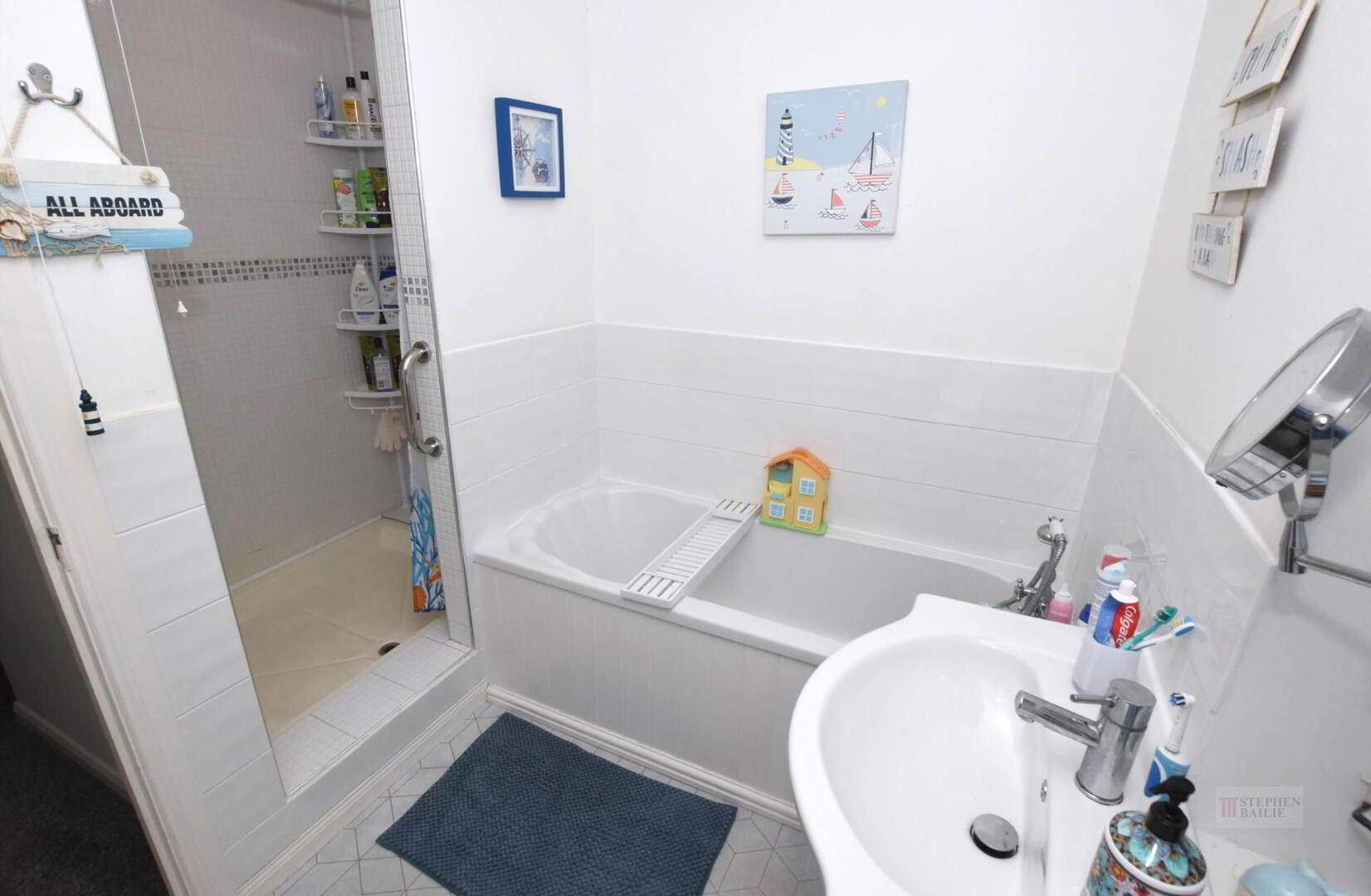 Panel bath with telephone hand shower. Vanitory unit. Low flush w.c. Tiled shower cubicle with electric shower. Part wall tiling.