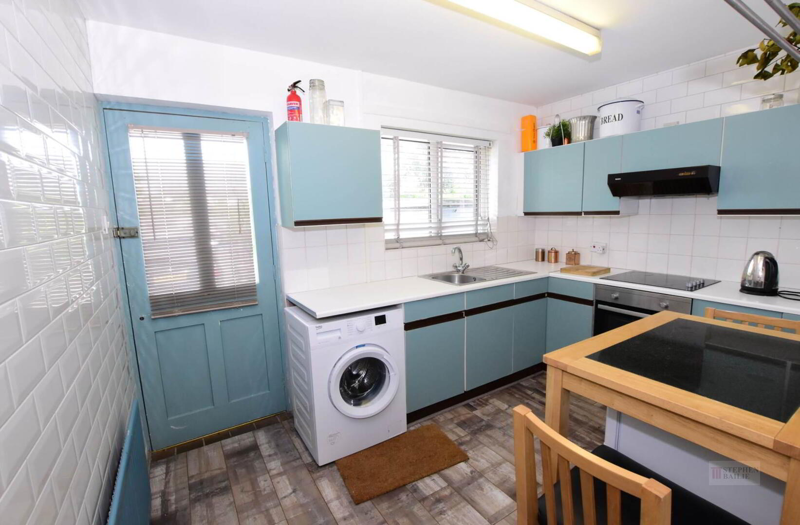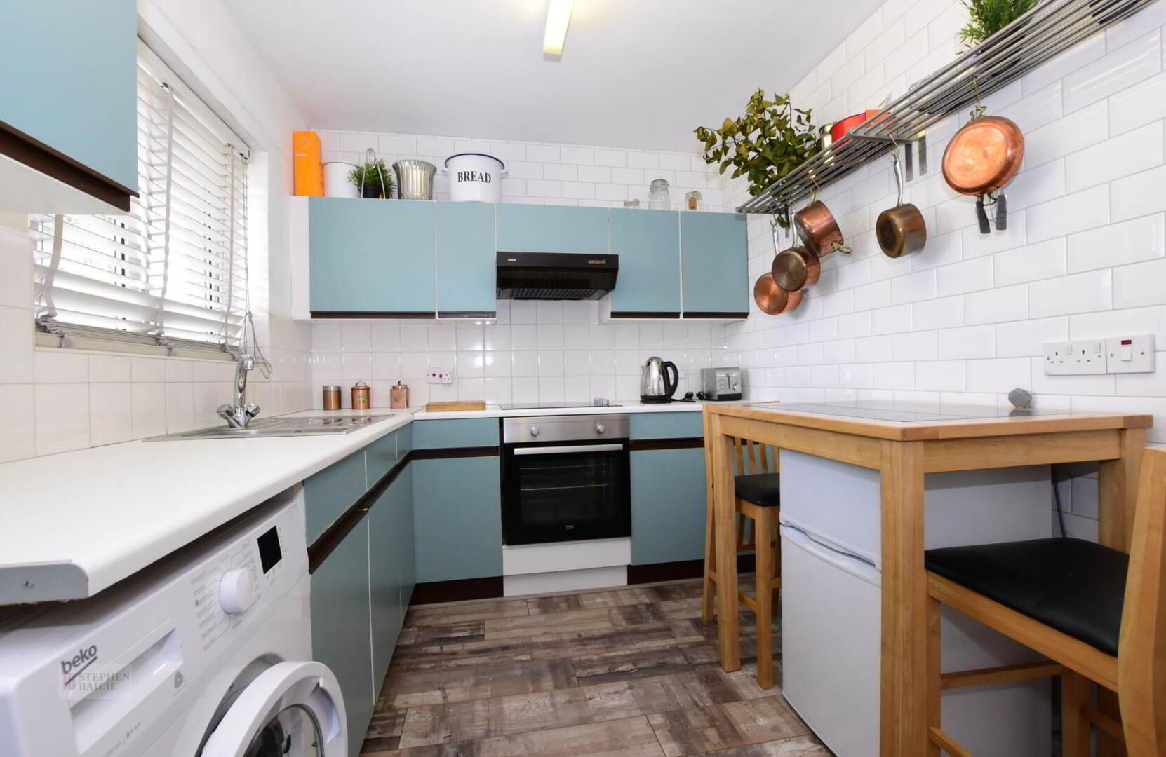 Single drainer stainless steel sink unit. Range of fitted high and low level kitchen units with roll edged work tops. Four ring electric hob and built in under oven. Part wall tiling.