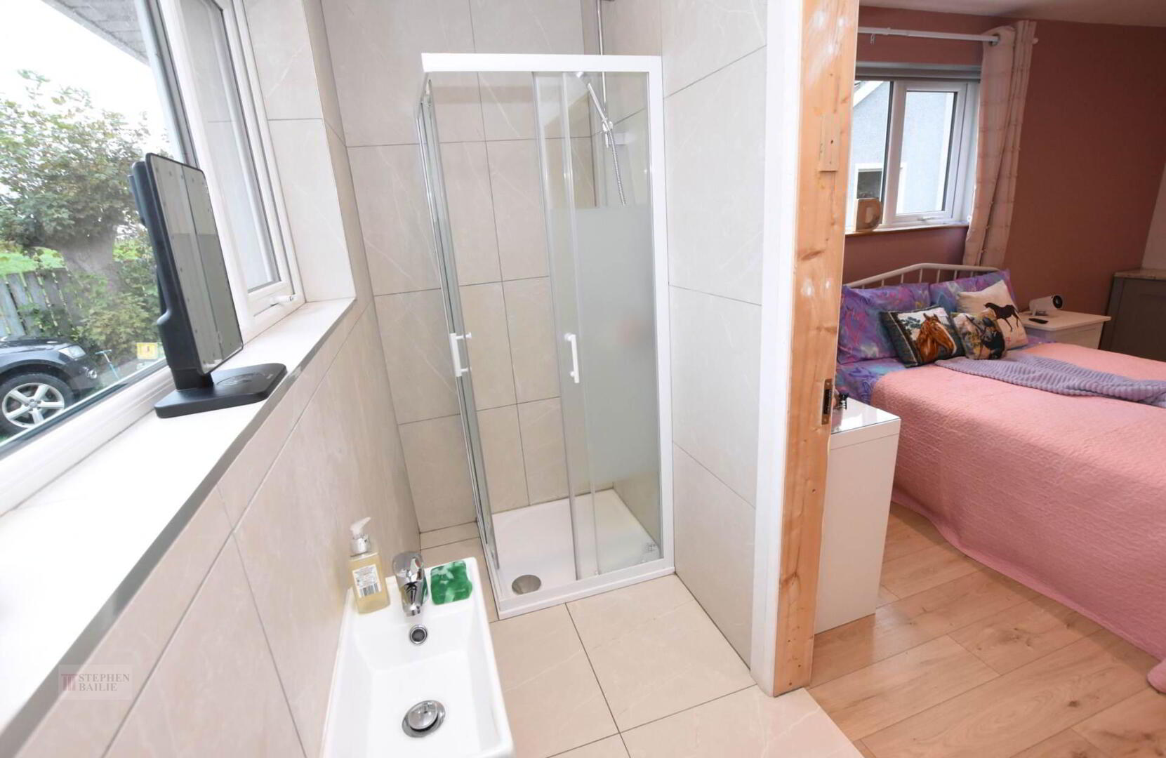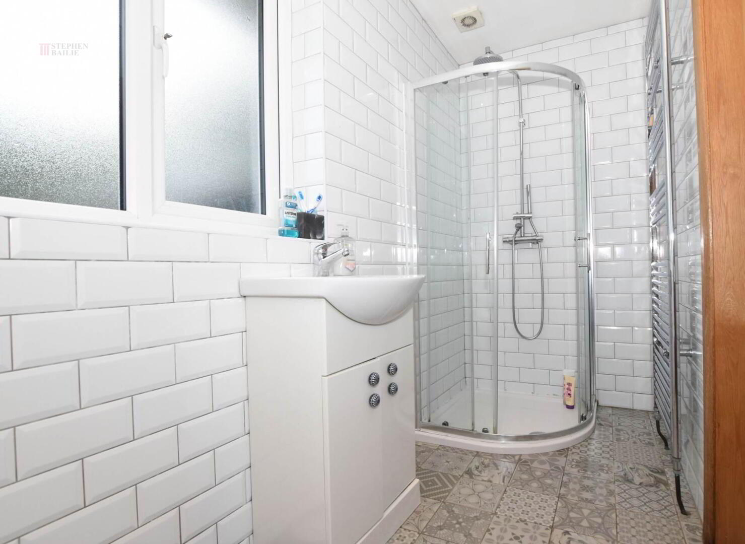 Pedestal wash hand basin. Low flush w.c. Shower cubicle with shower. Ffull wall tiling. Ceramic tiled floor.