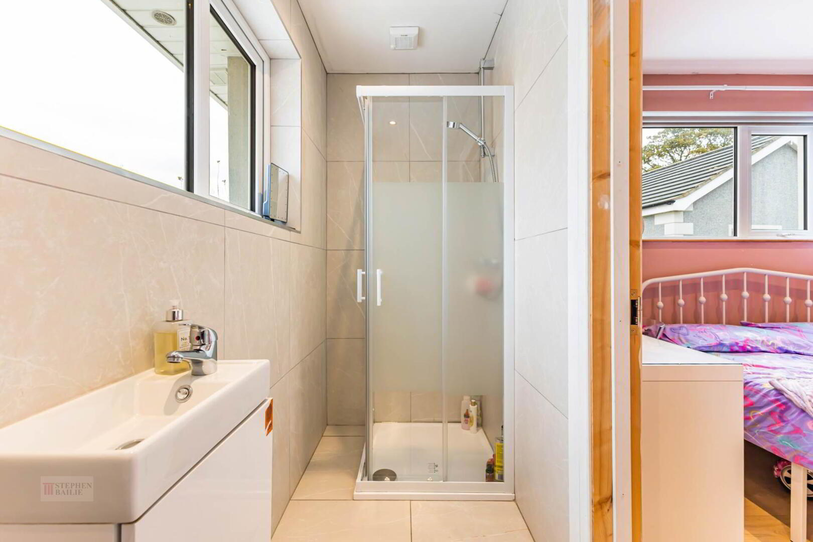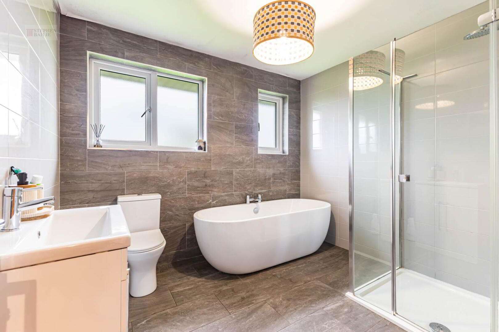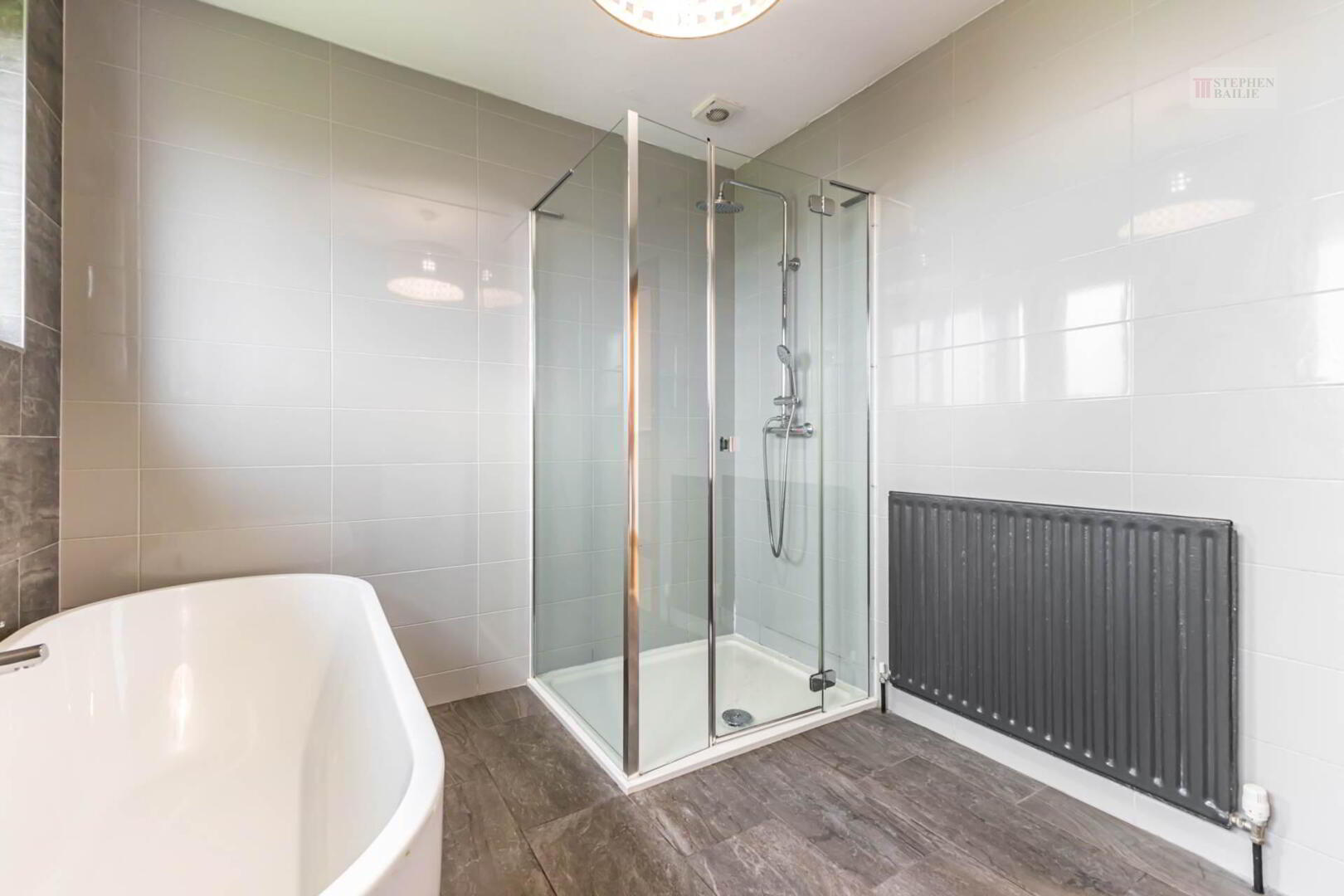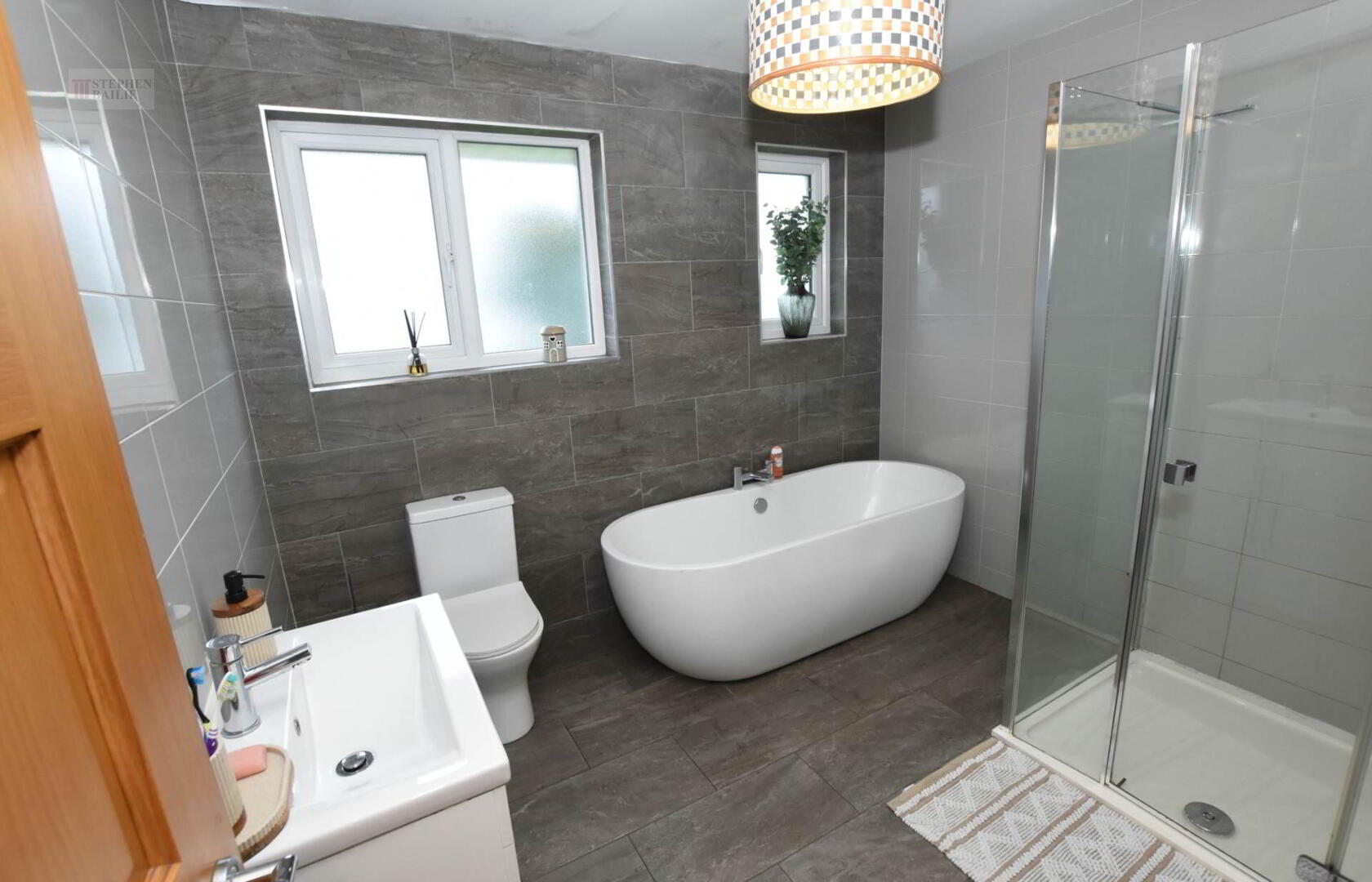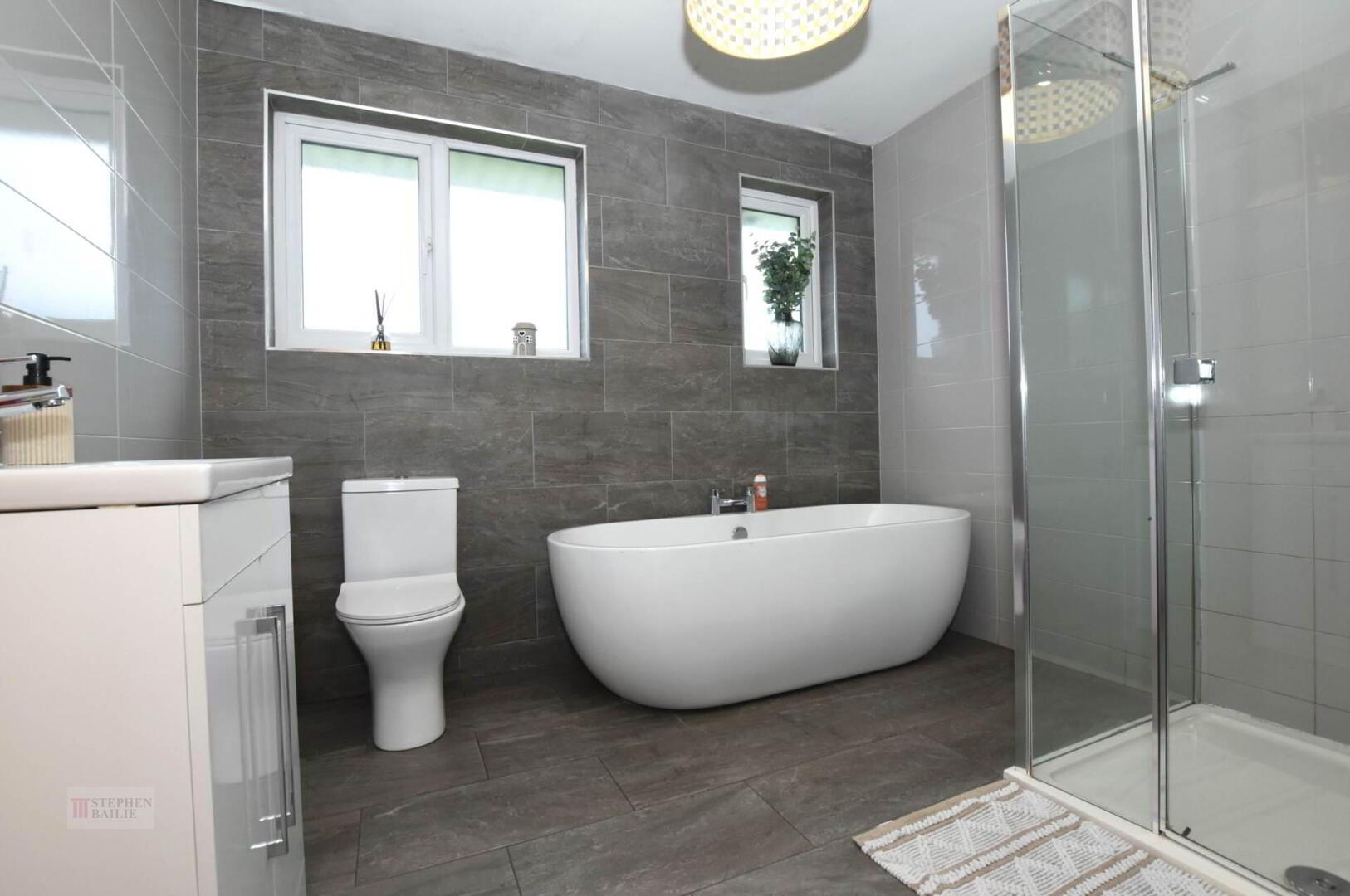 Free standing bath with mixer taps. Vanitory unit. Low flush w.c. Shower cubicle with electric shower. Ceramic tiled floor. Full wall tiling.